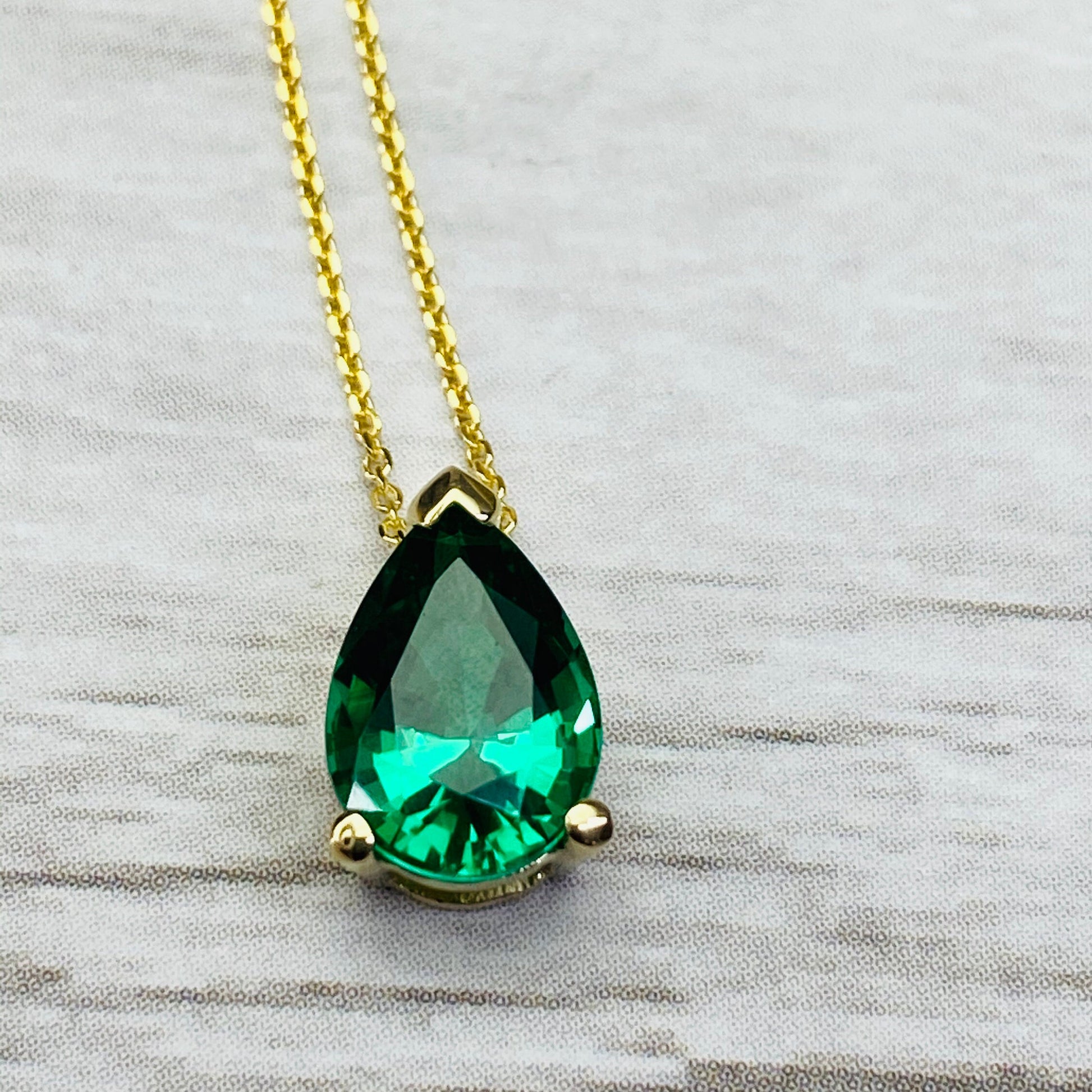 This is a Pear Shape Emerald Solitaire Pendant Necklace For Ladies set in 14K Yellow Gold. The emerald is the May Birthstone Pendant. It's a great Gift For Her. This vintage style Ladies Emerald Necklace is a 2 carat three prong teardrop layering statement necklace.
